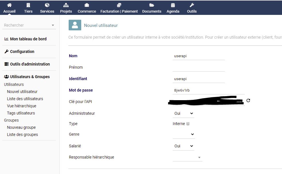 - De lui affecter les droits dont vous avez besoin « Proposition, Facturation, API etc… »